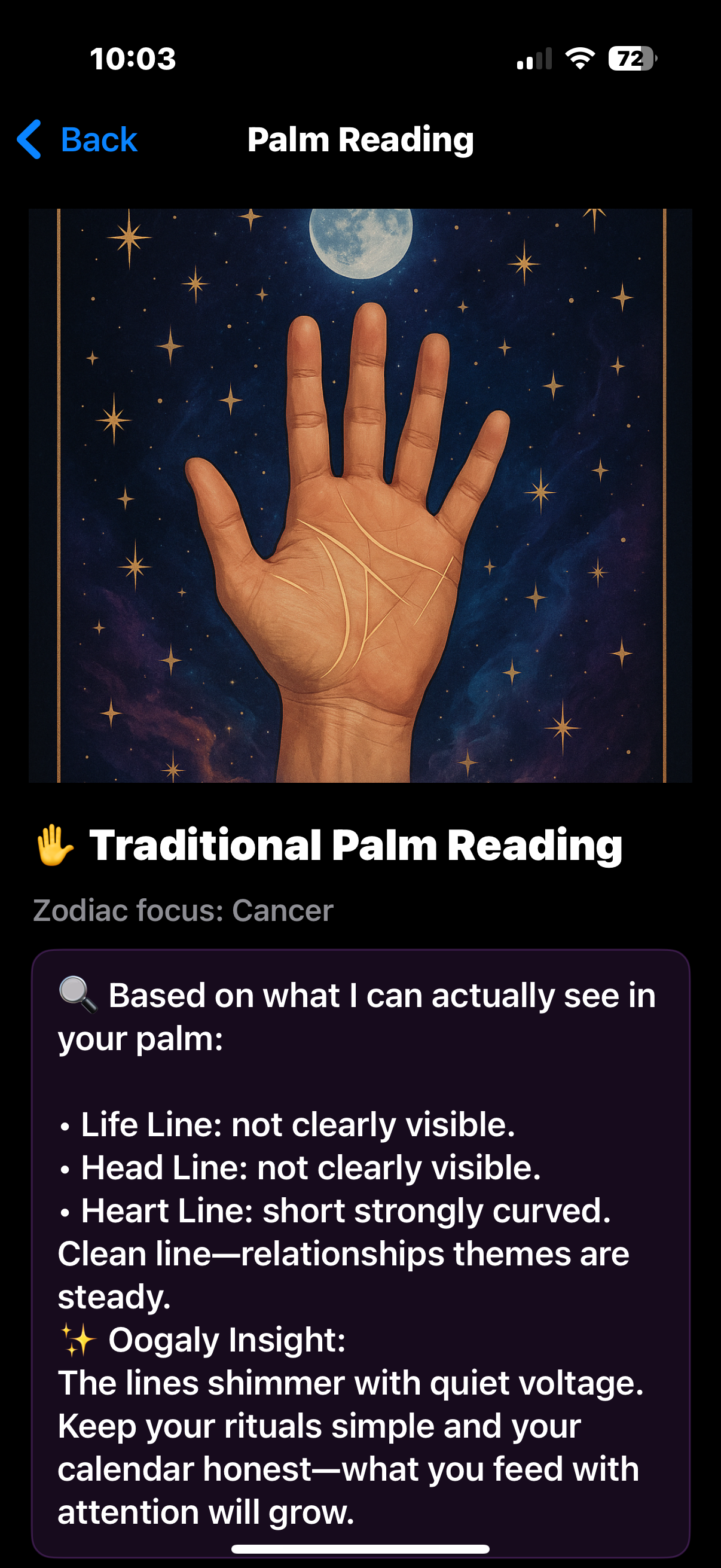 “Ask better questions. Get answers filtered through your zodiac, your timing, and your palm.”